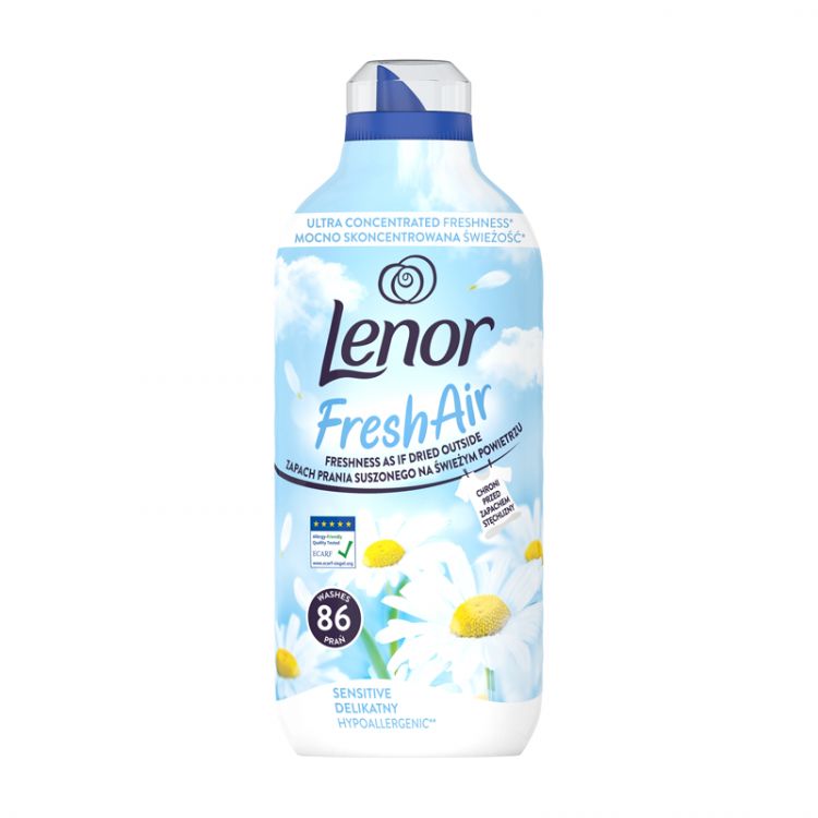 Vychutnajte si sviežosť oblečenia sušeného vonku, aj keď ho sušíte dnu. Ultrakoncentrované svieže zloženie aviváže Lenor Fresh Air je koncentrovanejšie ako iné aviváže Lenor. Získate tak Xx praní v menšej fľaši. Vďaka inovatívnej technológii potrebujete len malé množstvo aviváže na to, aby ste nadobudli pocit vysušenia na čerstvom vzduchu v akomkoľvek počasí. Spolu s ochranou proti zatuchnutému zápachu vám aviváž Lenor Fresh Air Sensitive poskytne dlhotrvajúce potešenie zo sviežosti. Vdýchnite túto jemnú sviežu vôňu. Táto zmes bohatých krémových tónov. Fľaša z recyklovaného plastu okrem vrchnáka, hrdla a návleku. Lenor Fresh Air bol vyvinutý spolu so zákazníkmi s cieľom napodobniť sviežosť bielizne sušenej vonku. Sviežosť uvoľňuje aj po vysušení bielizne, pri jej skladovaní v skrini a dokonca aj pri pohybe.