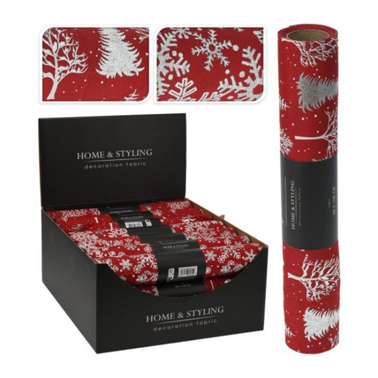 Organza látková 28x250 cm - červená, motív snehové vločky / stromy