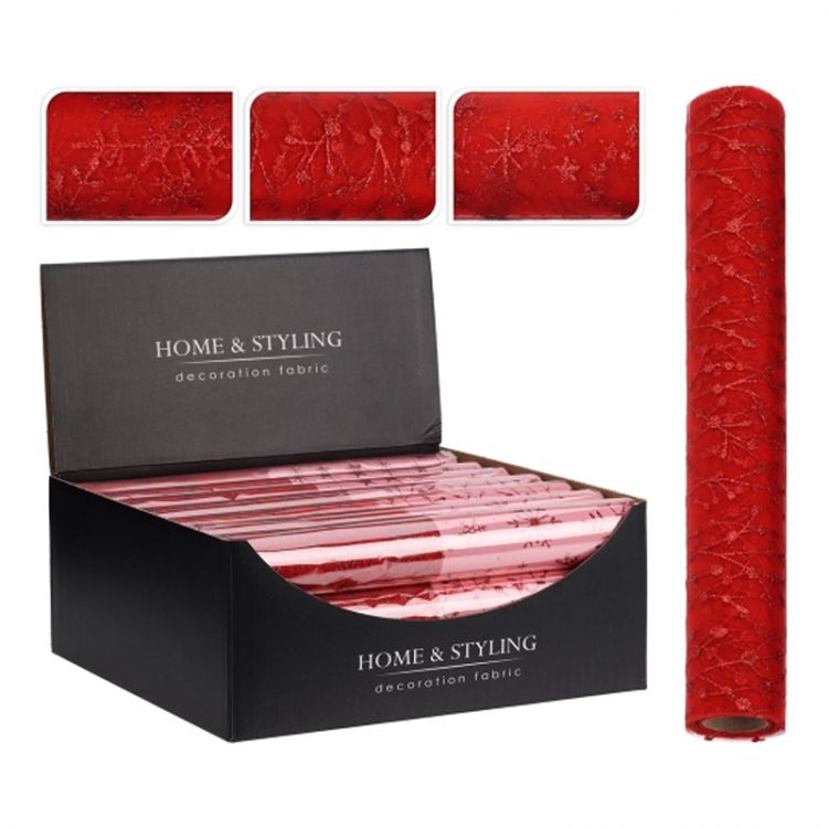 Organza látková 30x500 cm - vzor hviedy, bobule, snehové vločky, červená farba