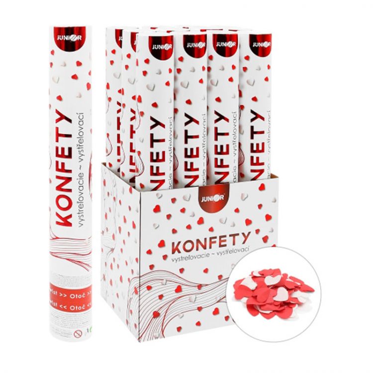 Vystreľovacie konfety - tuba 40 cm, biele a červené papierové srdiečka