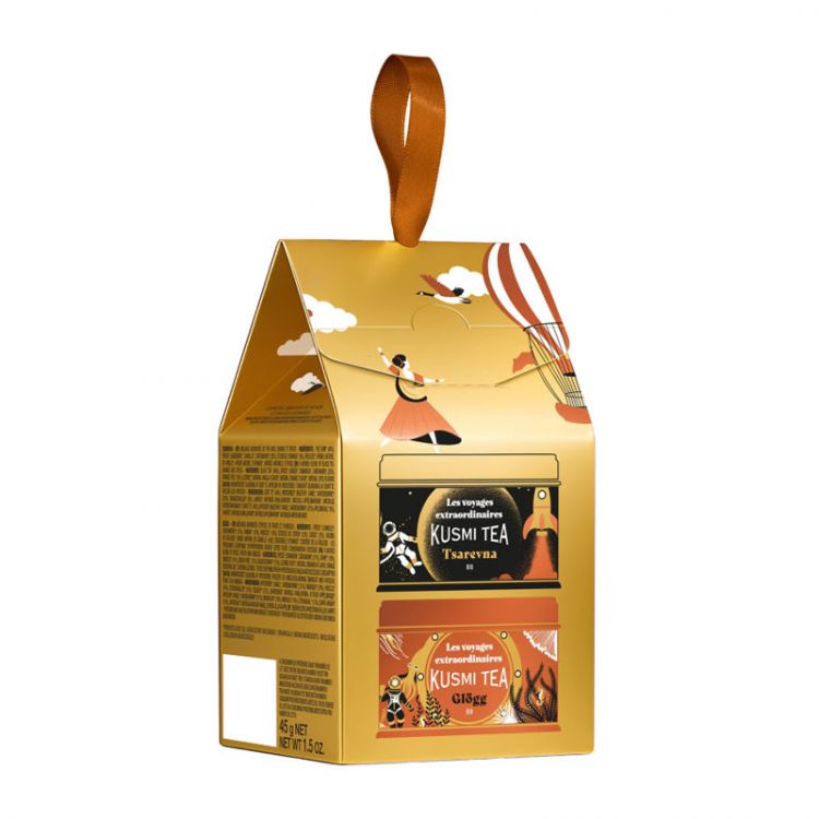 Vnútri nájdete dve exkluzívne miniatúry: Tsarevna (20 g), organický vianočný čierny čaj s očarujúcimi tónmi pomaranča, vanilky a korenia; a Glögg (25 g), sviatočný organický bylinný čaj príjemne okorenený štipľavými nádychmi ibišteka, hrozna a čiernych ríbezlí.