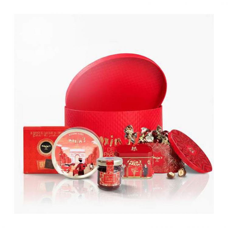 Maxims lieskovce v mliečnej čokoláde v mini oválnej dóze 40g: mliečna čokoláda: minimálne 30%, (cukor, kakaové maslo, sušené plnotučné mlieko, kakaová hmota, sušené odtučnené mlieko, laktóza (mlieko), jačmenný slad (lepok), emulgátor: sójový lecitín (E322), arómy), lieskové orechy (40%), leštiaca látka: arabská guma E414, glukózový sirup. Maxims medové cukríky v okrúhlej dóze "Arc de Triomphe" 50g: repný cukor, glukózový sirup, med 20%. Maxims štvorčeky z mliečnej čokolády 39g: cukor, kakaové maslo, sušené plnotučné mlieko, kakaová hmota, praliné 6% (cukor, mandle, pražené lieskové orechy), emulgátor: sójový lecitín (E322), prírodná vanilková aróma. : Môže obsahovať stopy vajec, pistácií, pekanových orechov, kešu orechov, lepku (pšenica, jačmeň), vlašských orechov. Maxims dóza so 4 čokoládovými rochers 20g: Mliečna čokoláda: cukor, praliné (22%) (lieskové orechy, cukor), kakaové maslo, kakaová hmota, sušené plnotučné mlieko, mandle (7%), chrumkavé crêpe lupienky (6%) (pšeničná múka (lepok), cukor, polotučné mlieko, koncentrované maslo (mlieko), soľ), chrumkavé cereálie (2%) (ryžová múka, cukor, soľ, kakaové maslo), laktóza (mlieko), koncentrované maslo (mlieko), kakaový prášok, emulgátor: sójový lecitín (E322), soľ, prírodná vanilková aróma. Horká čokoláda: kakaová hmota, cukor, kúsky kakaových bôbov (7%), kakaové maslo, koncentrované maslo (mlieko), glukózový sirup, stabilizátor: sorbitol (E420), stabilizátor: glycerol (E422), smotana (mlieko), emulgátor: sójový lecitín (E322), prírodná vanilková aróma. Môže obsahovať stopy vajec, sezamových semienok, pistácií, pekanových orechov, kešu orechov, vlašských orechov. Maxims jahodový džem 42g: cukor, jahody (50%), koncentrovaná citrónová šťava, želírujúca látka: pektín (E440).