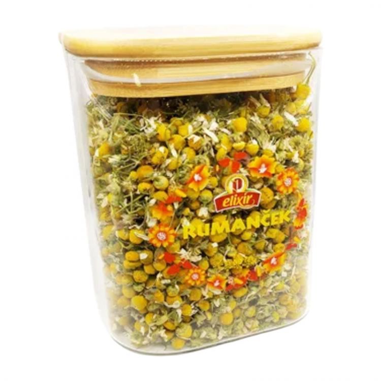 Rumanček kamilkový – sypaný čaj v sklenenej dóze je prírodný čaj z kvetov rumančeka, známy svojimi upokojujúcimi a protizápalovými účinkami. Tento čaj je výborným spoločníkom pre každodennú starostlivosť o organizmus, obzvlášť pri zápalových prejavoch, podráždení alebo pri hľadaní relaxácie. Sypaný čaj je zabalený v elegantnej borosilikátovej dóze, ktorá zabezpečuje dlhodob