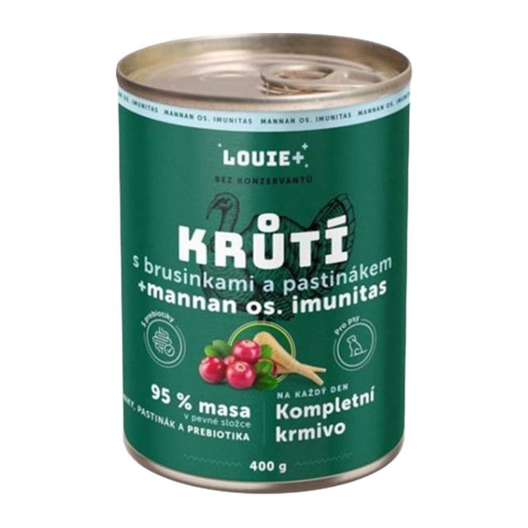 Zloženie: morčacie mäso, vývar, zmäkčené morčacie kosti, brusnice, paštrnák, prebiotiká (mannanoligosacharidy/fruktooligosacharidy), minerály a vitamíny.