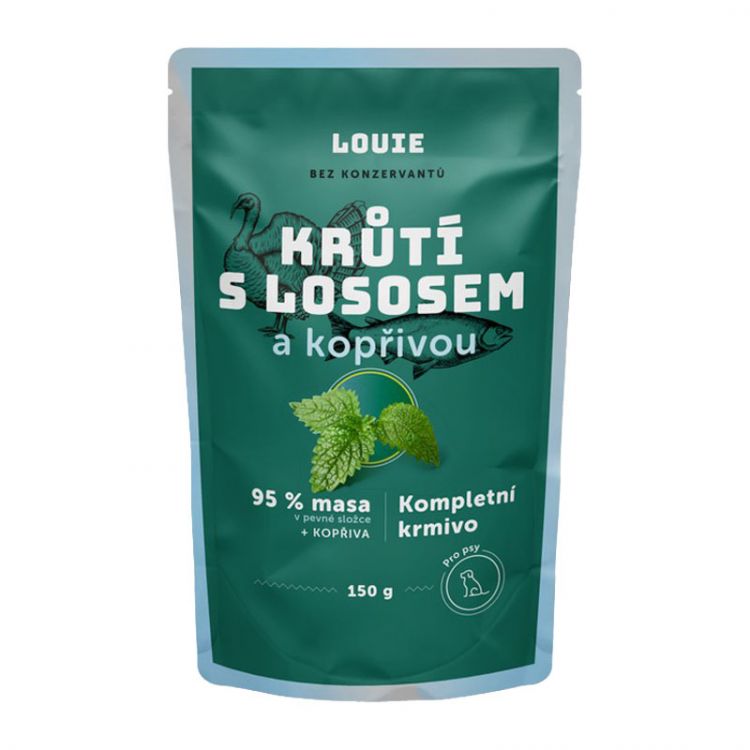 LOUIE Kompletné krmivo pre psov s 95% obsahom mäsa – morčacie s lososom a žihľavou: