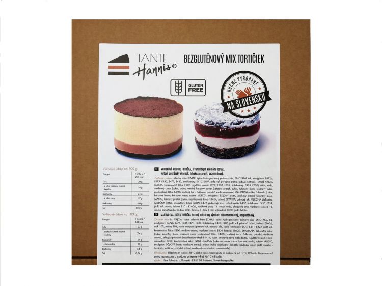 Vanilkový mousse tortička: mliečny krém (CMAR, úplne hydrogenovaný palmový olej, SMOTANA 6%, emulgátory: E472b, E475, E435, E471, E433, stabilizátory: E410, E407, jedlá soľ, prírodná aróma, farbivo: E160a), TEKUTÉ VAJCIA (VAJCIA, konzervačná látka: E202, regulátor kyslosti: E270, E330, E331, stabilizátory: E415, E520), cukor, voda, vanilínový cukor (cukor, aróma vanilín), kakaový posyp (kakaový prášok, cukor, kukuričný škrob, hroznový cukor, protispekavá látka: E470b, rastlinný tuk – Salbaum, prírodná vanilková aróma), MANDĽOVÁ múka, čokoláda (cukor, kakaová hmota, kakaové maslo, sušené MLIEKO, emulgátor: SÓJOVÝ lecitín, vanilkový extrakt), kukuričný škrob, MASLO, krémový prášok (cukor, modifikovaný škrob: E1414, sušená SRVÁTKA, palmový tuk, MLIEČNA bielkovina, MLIEČNY prášok, emulgátory: E322 (SÓJA), E472, glukózový sirup, zahusťovadlo: E407, stabilizátor: E450, E339, jedlá soľ, aróma, farbivá: E101, E160a), vanilková pasta 1% (cukor, voda, glukózový sirup, vanilkové semená 1%, aróma, zahusťovadlo: E440a, E407, farbivo: E160a, E100, antioxidant: E300), jedlá želatína Makovo – malinová tortička: VAJCIA, cukor, mliečny krém (CMAR, úplne hydrogenovaný palmový olej, SMOTANA 6%, emulgátory: E472b, E475, E435, E471, E433, stabilizátory: E410, E407, jedlá soľ, prírodná aróma, farbivo: E160a), mak 10%, maliny 10%, voda, margarín (palmový tuk, repkový olej, voda, emulgátor: E475, E471, E322, jedlá soľ, konzervačná látka: E200, maslová aróma, regulátor kyslosti: E330, farbivo: E160a), SMOTANA, dekoračný cukor (cukor, kukuričný škrob, hroznový cukor, protispekavá látka: E470b, rastlinný tuk – Salbaum, prírodná vanilková aróma), želírujúci prípravok (modifikovaný škrob E1414, cukor, citrónová šťava, maltodextrín, regulátor kyslosti: E330, antioxidant: E300, konzervačná látka: E202), čokoláda (kakaová hmota, cukor, kakaové maslo, sušené MLIEKO, emulgátor: SÓJOVÝ lecitín, vanilkový extrakt), ryžová múka, stabilizátor šľahačky (glukóza, cukor, jedlá želatína - hovädzia, jedlá soľ, prírodné arómy), vanilínový cukor (cukor, aróma vanilín)