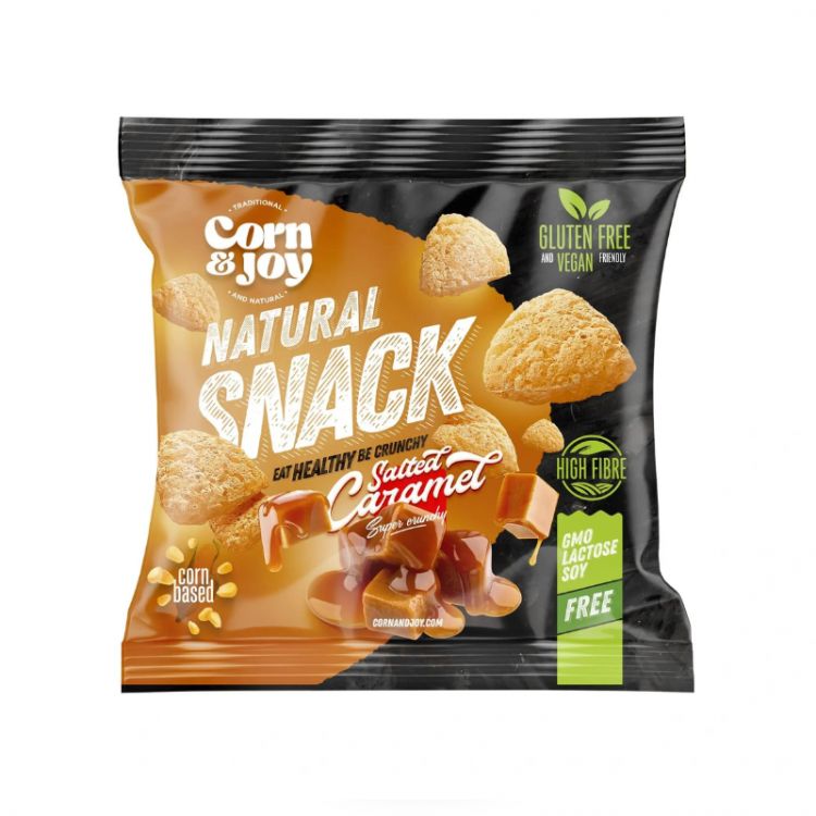 SK: Kukuričný snack s príchuťou slaného karamelu. Extrudovaný výrobok. Bezgluténový.