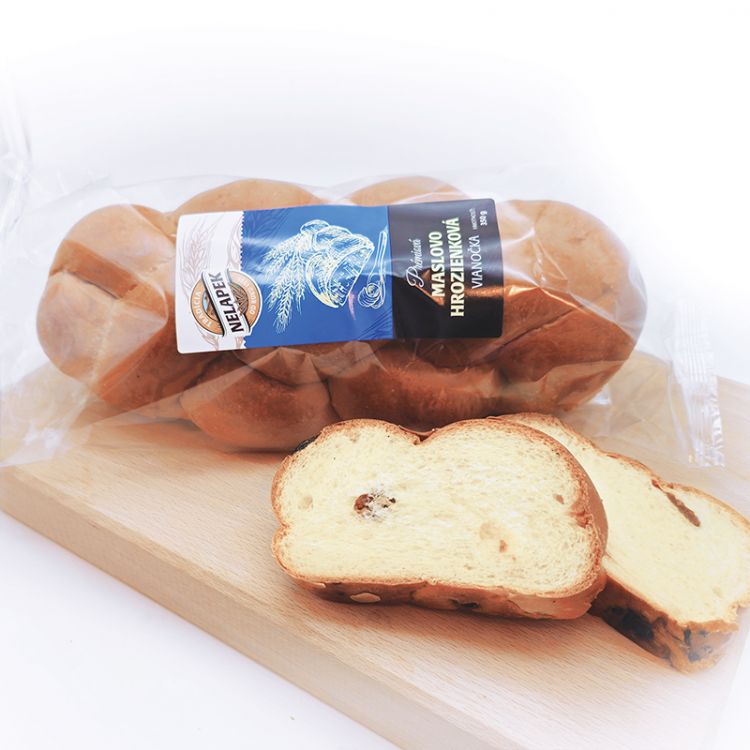 pšeničná múka, pitná voda, hrozienka (15%), cukor, maslo kravské (5,10%), droždie, bravčová masť, pekárska zmes na výrobu jemného kysnutého pečiva (pšeničná múka, pšeničná sladová múka, emulgátor: mono- a diglyceridy mastných kyselín, mono- a diglyceridy mastných kyselín s kyselinou mono- a diacetylvínnou, repkový lecitýn; cukor, stabilizátor: guarová guma, celulózová guma; sušené nízkotučné mlieko, aróma, korenie, farbivo: beta-karotén; múku upravujúca látka: kyselina askorbová; enzýmy), jedlá soľ, prípravok na predĺženie čerstvosti (pšeničná múka, sójová múka, enzýmy), konzervačná látka: propionát vápenatý; lesk na jemné pečivo (mliečna bielkovina, sušené vajcia, emulgátor: fosforečnany sodné; aróma, farbivo: betakarotény).