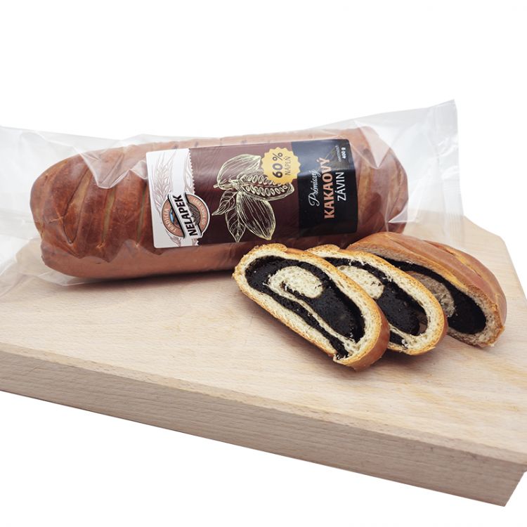 60% kakaová náplň [kakaová zmes (cukor, 9% kakaový prášok, modifikovaný škrob, karobový prášok, vanilková aróma); pitná voda, strúhanka (PŠENIČNÁ MÚKA, pitná voda, droždie, jedlá soľ), cukor, glukózový sirup, SUŠENÁ SLADKÁ SRVÁTKA, konzervačná látka: sorban draselný], PŠENIČNÁ MÚKA, pitná voda, cukor, droždie, bravčová masť, margarín (rastlinné oleje a tuky: palmový, repkový, slnečnicový; voda pitná, emulgátor: lecitíny, mono a diglyceridy mastných kyselín; soľ, kyselina: kyselina citrónová; farbivo: karotény; aróma), zlepšujúci prípravok na výrobu jemného pečiva (PŠENIČNÁ MÚKA, PŠENIČNÝ GLUTÉN, PŠENIČNÁ SLADOVÁ MÚKA, sušený kvas: PŠENIČNÁ MÚKA, štartovacia kultúra; enzýmy, látka zlepšujúca múku: kyselina askorbová, SÓJOVÁ MÚKA), jedlá soľ, konzervačná látka: propionát vápenatý; lesk na jemné pečivo (MLIEČNA BIELKOVINA, SUŠENÉ VAJCIA, aróma, vanilín, farbivo: karotény).