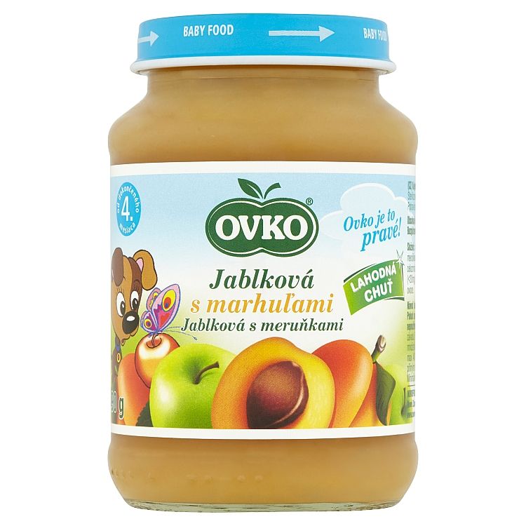 Ovocné pretlaky 80% hm. (jablkový 65,5% hm., marhuľový 14,5% hm.), Voda, Cukor, Kukuričný škrob, Bio celozrnná ryžová múka, Vitamín C, Na výrobu 100g výrobku bolo použitých 95,5 g ovocia