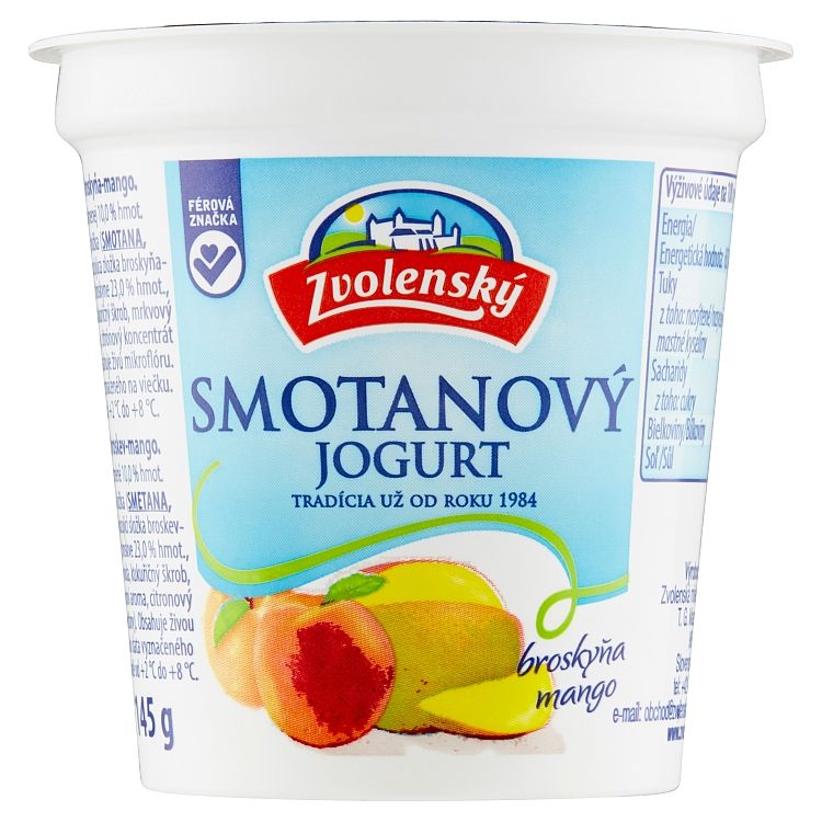 SMOTANA, ochucujúca zložka broskyňa-mango 15,0 % hmot. (cukor, broskyne 32,0 % hmot., mango 18,0 % hmot., kukuričný škrob, mrkvový koncentrát, voda, prírodná aróma, citrónový koncentrát, zahusťovadlo: pektíny), JOGURTOVÁ KULTÚRA. Obsahuje živú mikroflóru.