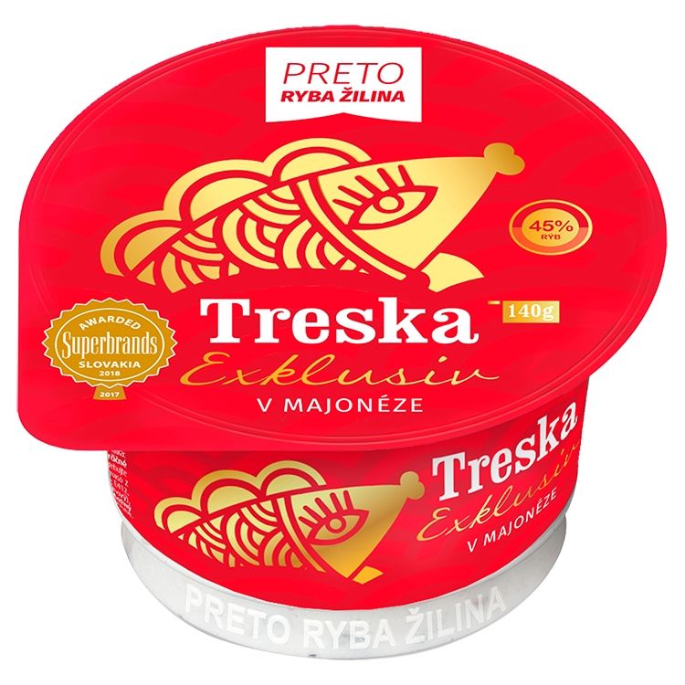 TRESKOVITÉ RYBY 45%, repkový olej, pitná voda, cibuľa, mrkva, kvaka, ryžová múka, cukor,HORČICA (pitná voda, HORČIČNÉ semeno, kvasný ocot liehový, glukózový sirup, jedlá soľ, koreniny), modifikovaný škrob, sušený VAJEČNÝ ŽĹTOK, kvasný ocot liehový, jedlá soľ, stabilizátory: E412, E415; uhorky, regulátory kyslosti: mliečnan sodný, kyselina mliečna; dextróza, konzervačná látka: sorban draselný.