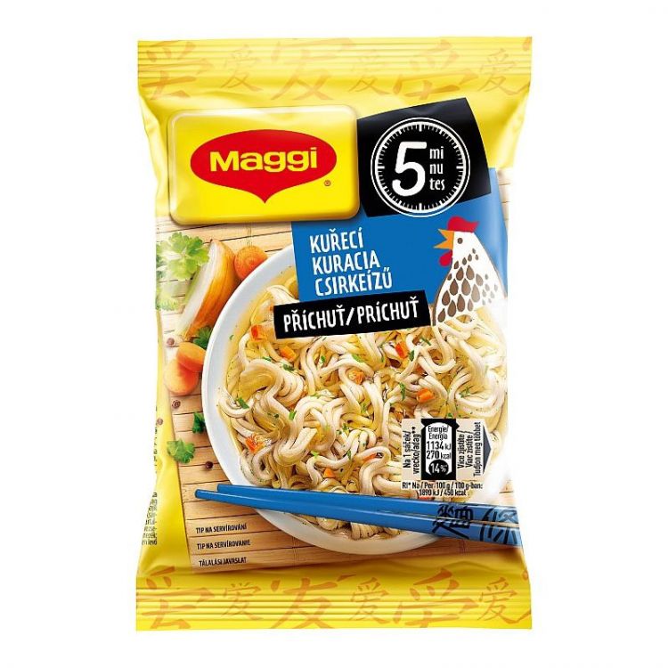 Smažené rezance 92,9 %, pšeničná múka, slnečnicový olej, pšeničný glutén , jedlá soľ, regulátor kyslosti (uhličitany draselné), stabilizátor (polyfosforečna, Koreniaci prípravok 7,1 %, jedlá soľ, zvýrazňovače chuti (glutaman sodný, guanylan disodný, inozínan disodný), cukor, sušená zelenina (mrkva 0,14 %, cibuľa 0,03 %, pór), arómy (obsahujú vajcia, pšenicu, sóju, koreniny (kurkuma, pažítka, čierne korenie, zelerová vňať, petržlenová vňať), sójový bielkovinový hydrolyzát, karamelizovaný cukrový sirup, slnečnicový olej, farbivo (riboflavíny), % - vztiahnuté na obsah zložky v celom výrobku