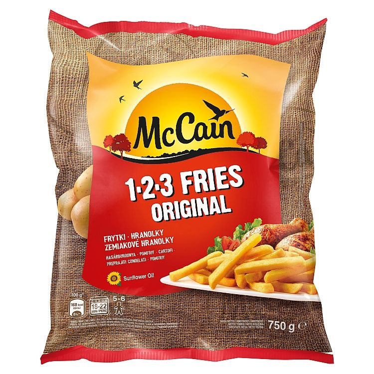 Starostlivo vybrané zemiaky, ošúpané, pokrájané na hranolky a jemne predsmažené. Lahodné a chrumkavé hranolky McCain.